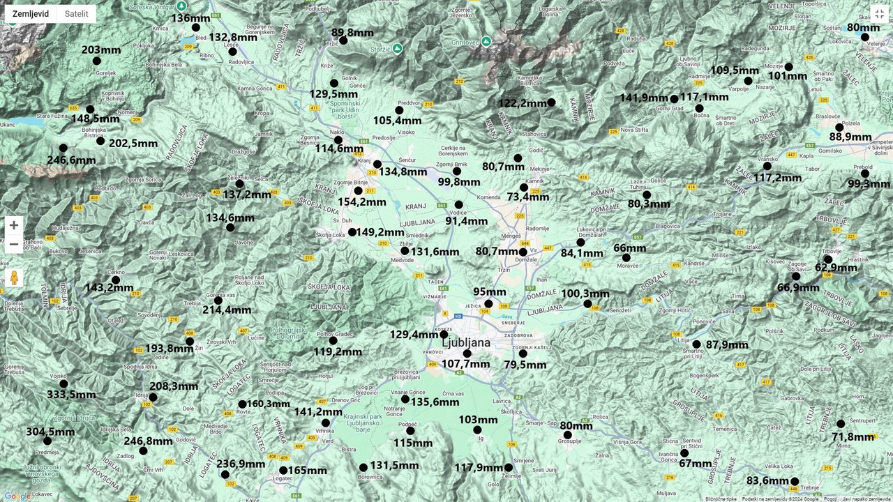 Skupna količina padavin od 2.10-4.10.2024 po zahodnem, osrednjem delu Slovenije...