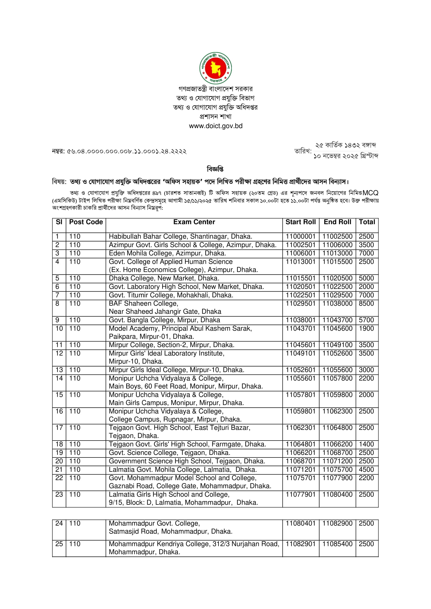 Department of ICT Office Sohayok MCQ Exam Seat Plan 2025 PDF 1
