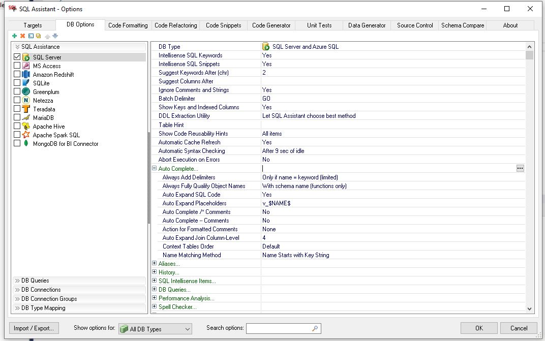 SQL Assistant DB Options screen