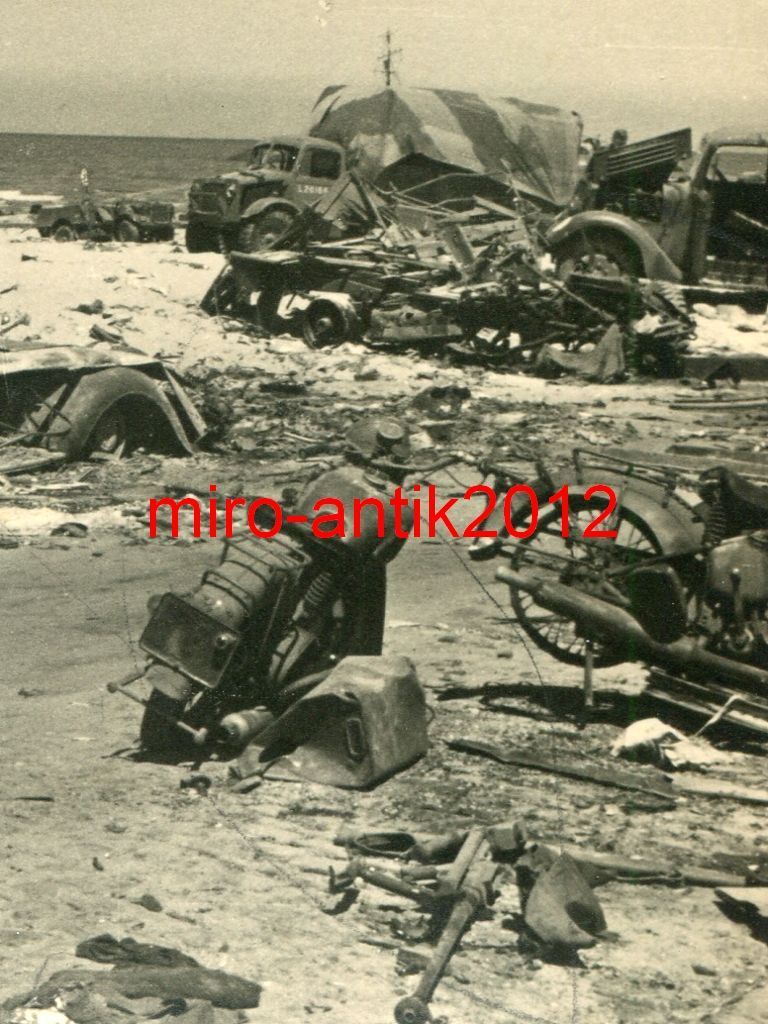 Foto, zerstörte englische LKW, PKW am Strand, Dü