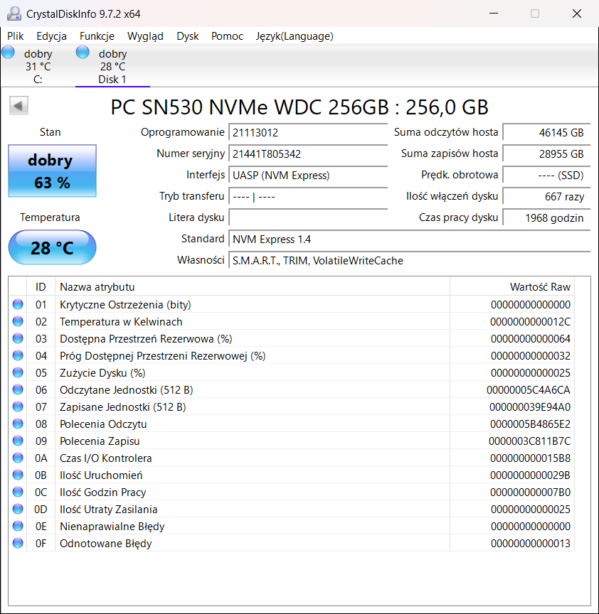 PC SN530 NVMe WDC 256GB 1968h