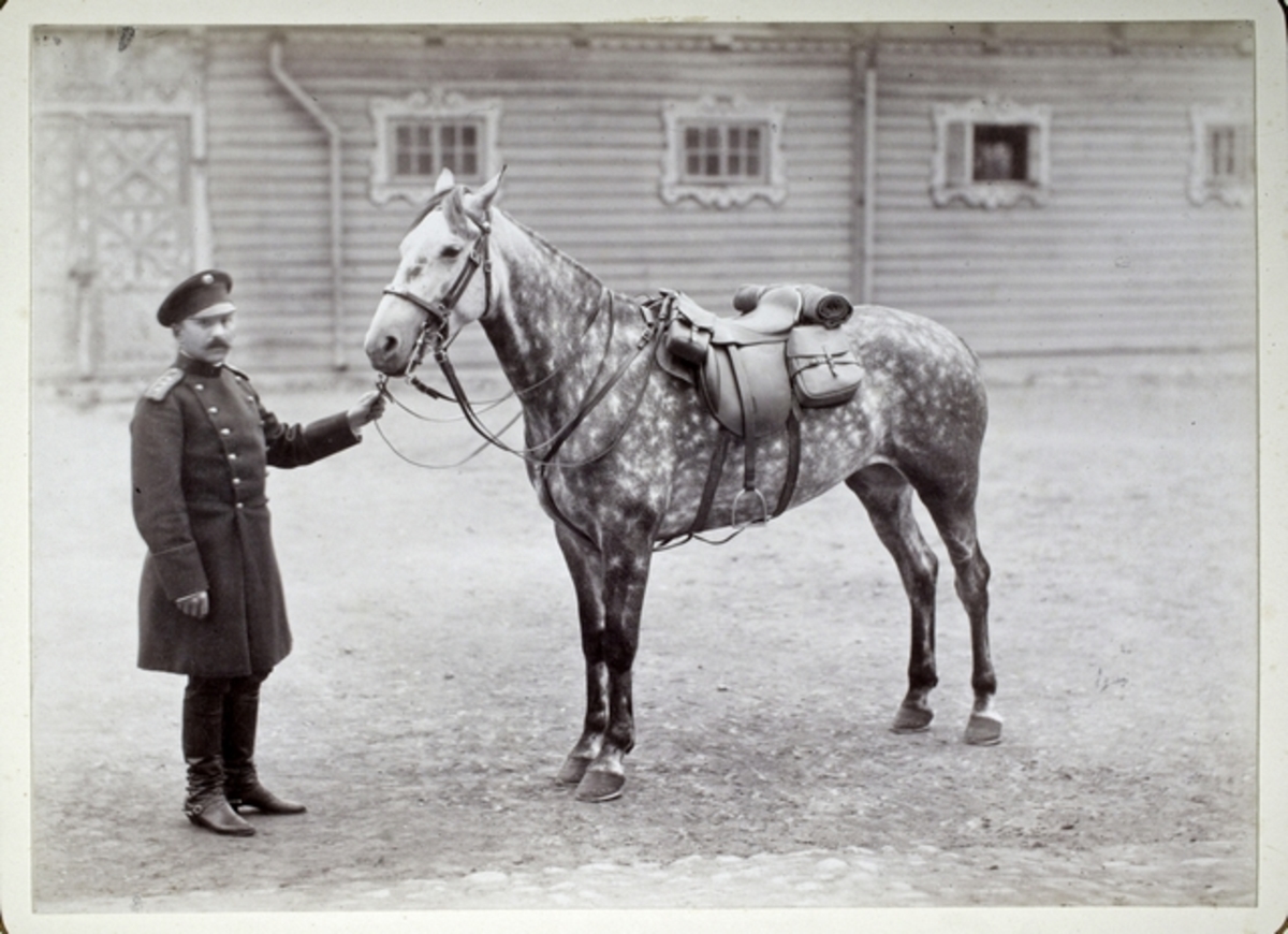 1891 Satuloitu ratsuhevonen sotilaspalvelijan pitelemänä pihalla-4