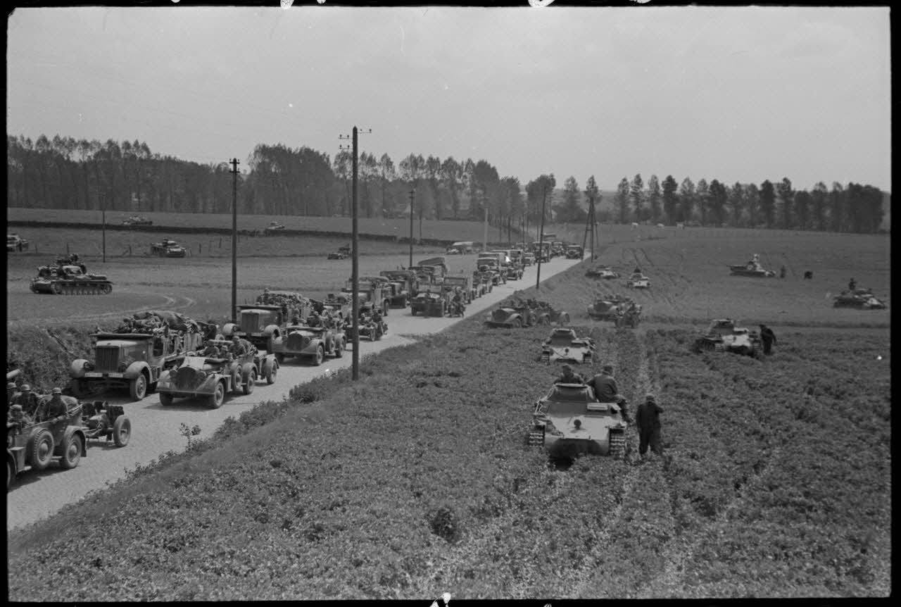 Durant la bataille de Gembloux (Belgique), une colonne de la 4e division blindée (Panzer-Division).