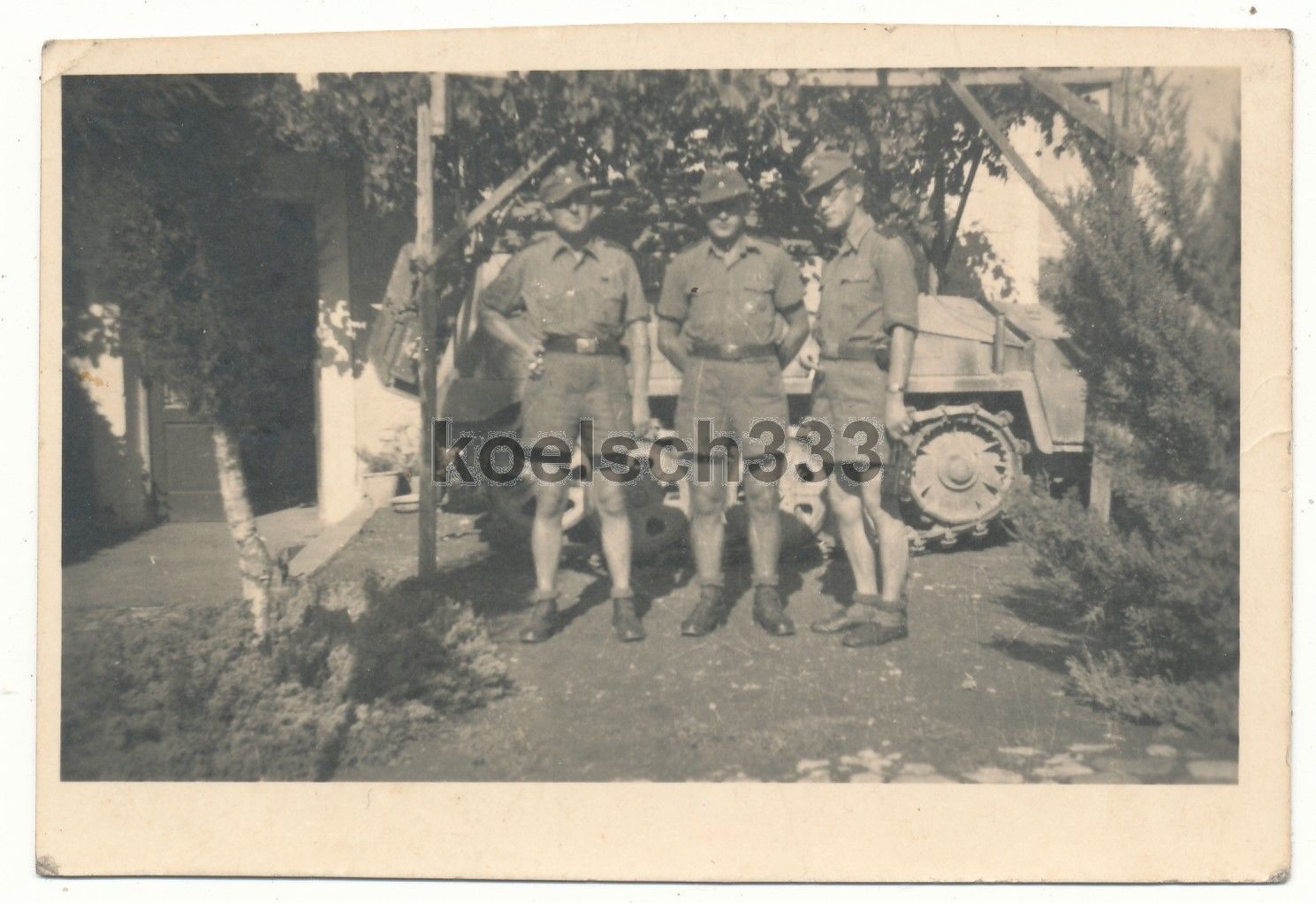 Foto Wehrmacht Soldaten in Tropenuniform vor Schützenpanzer Lami
