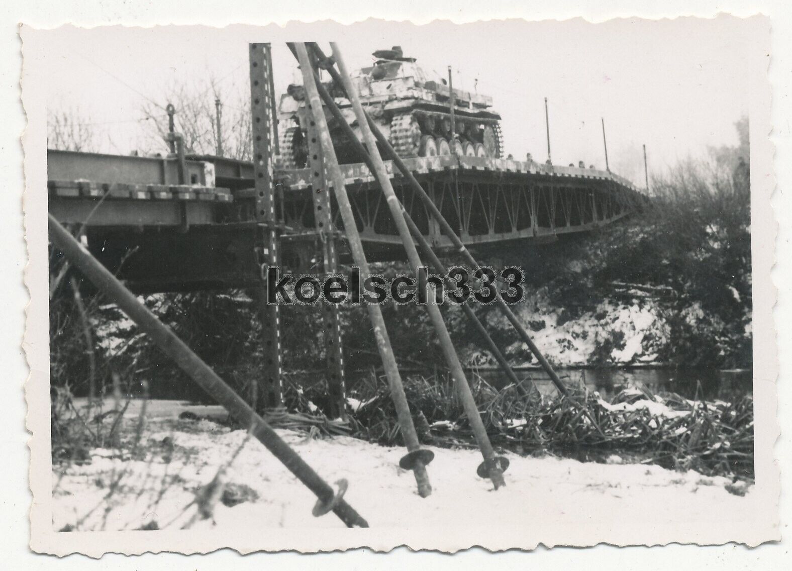 Foto Panzer Kampfwagen der Wehrmacht auf einer Kriegsbrücke im Osten im Winter