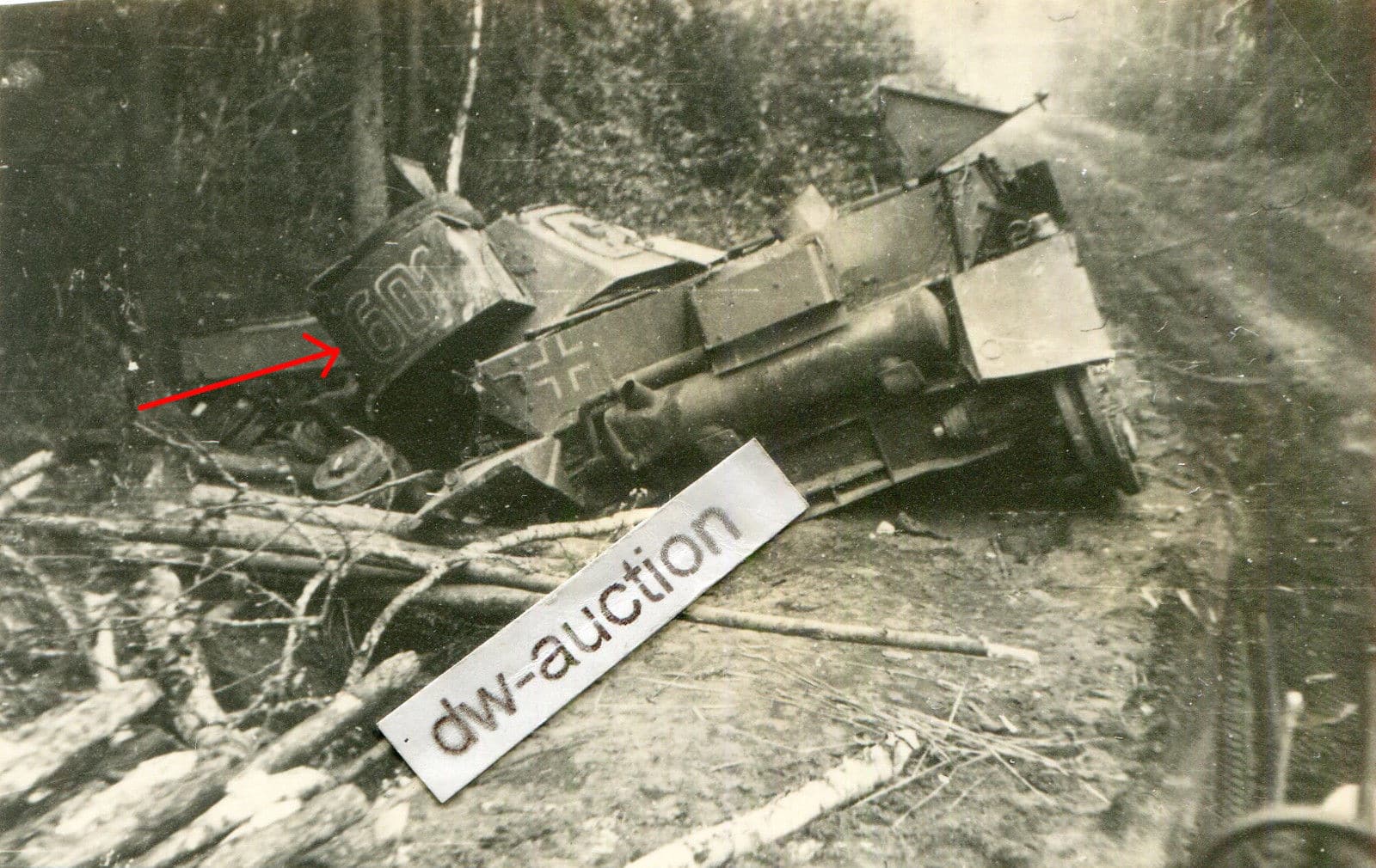 zerstörter dt. Panzer mit Nummer 601 auf Turm
