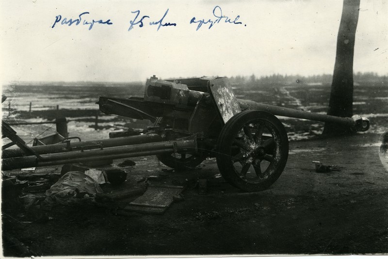 Брошенное немецкое 75-мм орудие, накрытое огнем советской артиллерии.