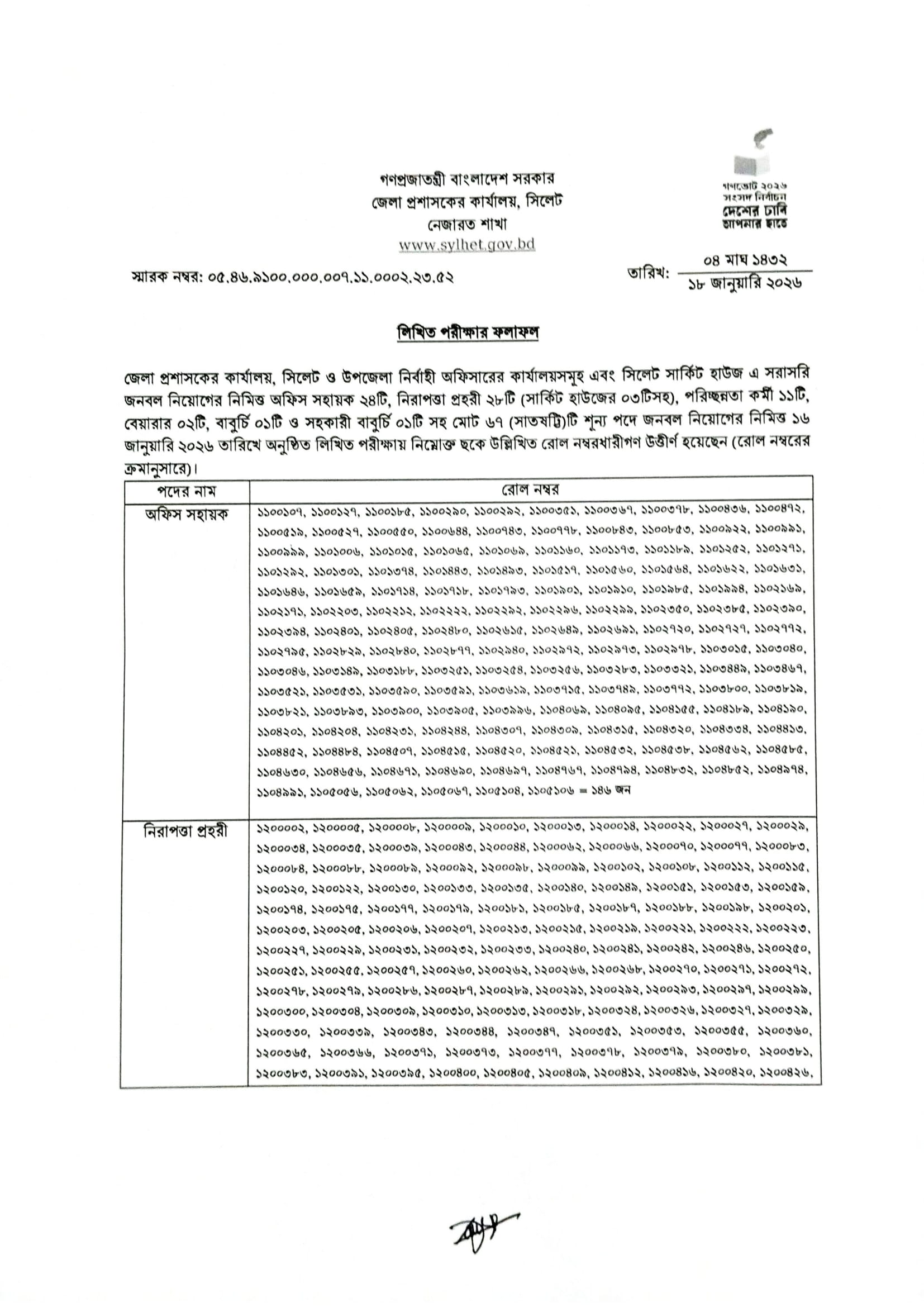 DC Office Sylhet Exam Result 2026 PDF 1