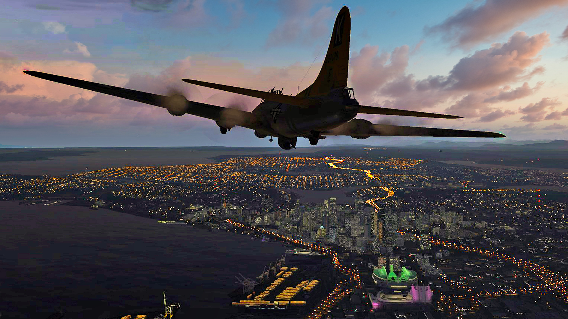 B17 over Seattle at sunset
