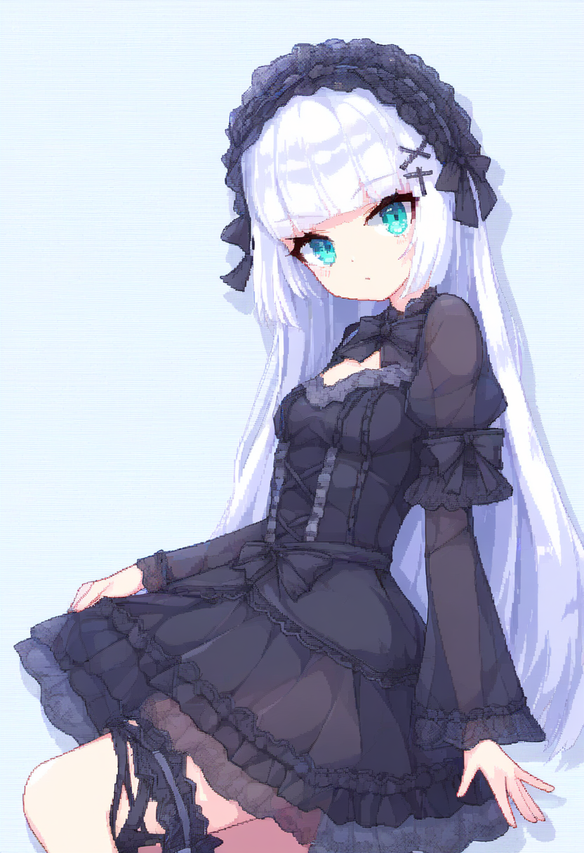 1girl, striped background, aqua eyes, long hair, hime cut, white hair, short ban s-4113545008