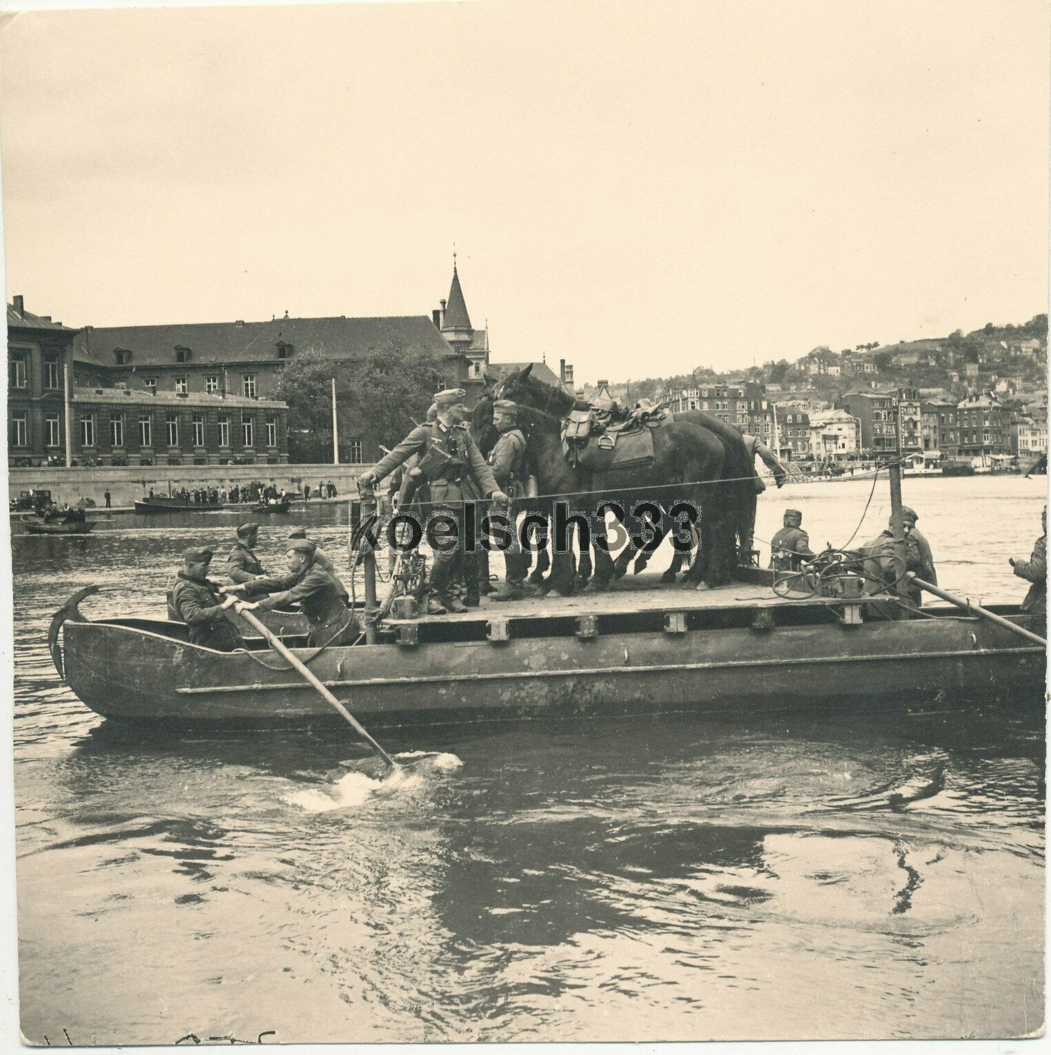 Foto übersetzen von Pferden mit Ponton Fährer über die Maas in Lüttich Belgien