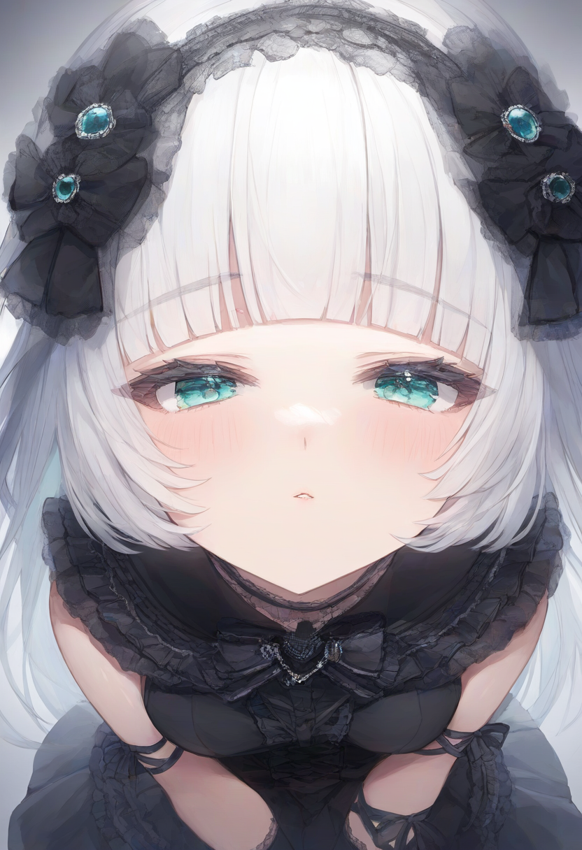 1girl, aqua eyes, long hair, hime cut, white hair, {short bangs}, small breasts, s-860849062