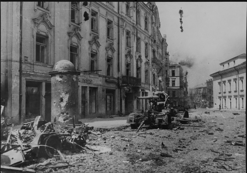 На улицах освобожденного Вильнюса немецкая разбитая техника.