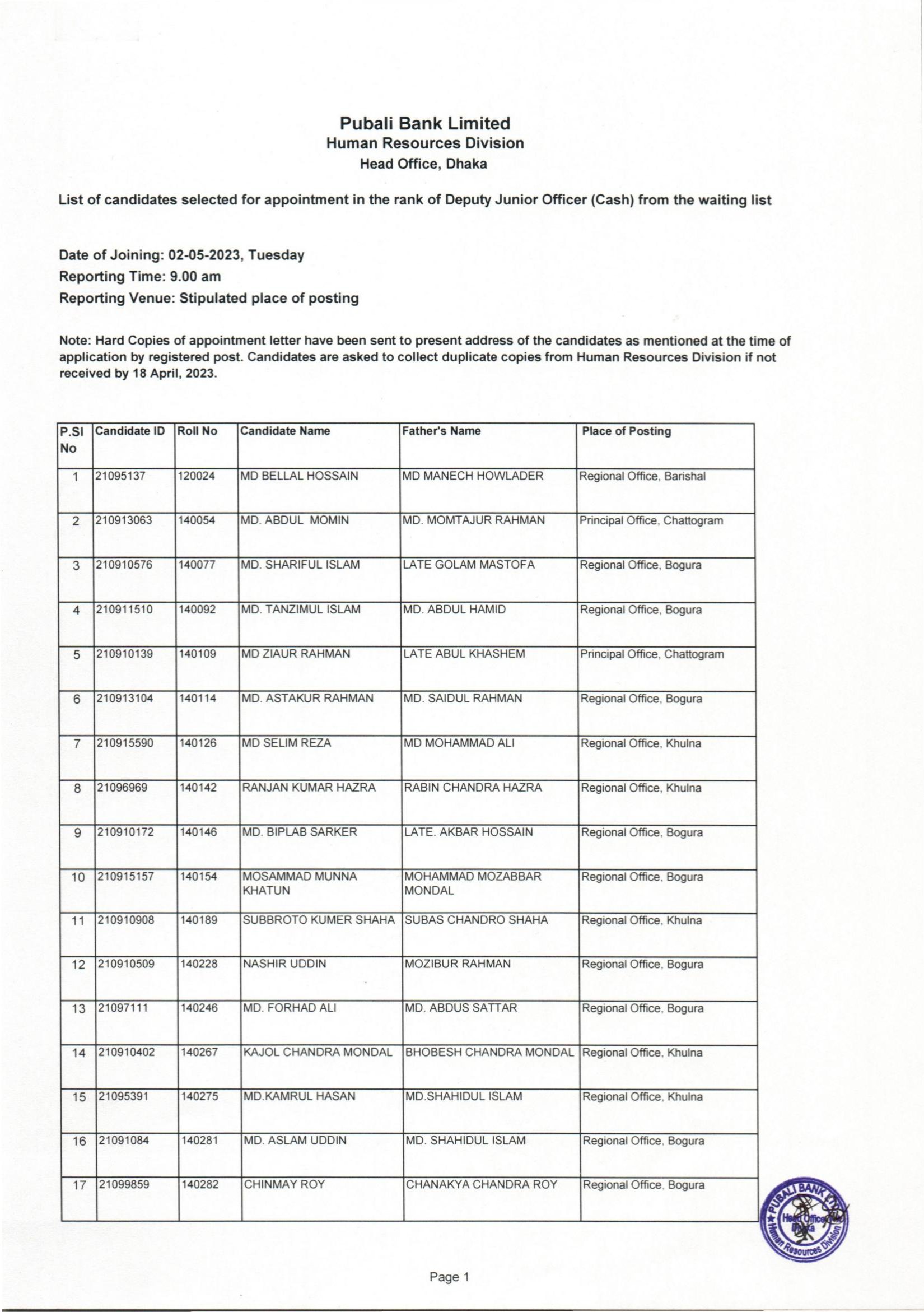 Pubali Bank Deputy Junior Officer (Cash) Exam Result From Waiting List 2023 PDF-01