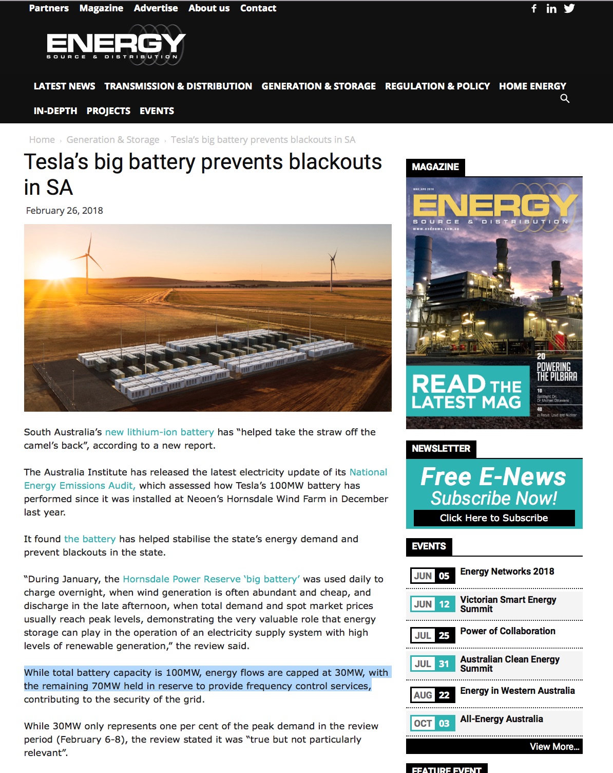 Tesla’BSAB Hornsdale South Australia 70MW Grid stabilisation 30M