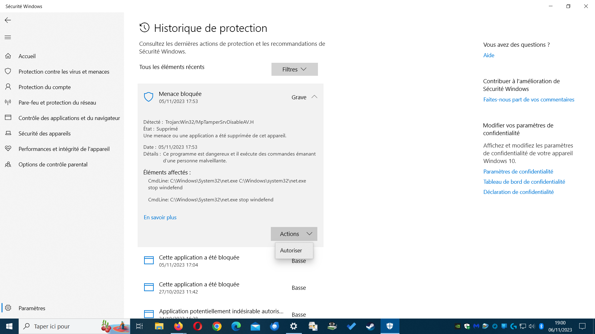 HISTORIQUE DE PROTECTION CLIC ACTIONS 06 NOVEMBRE 2023