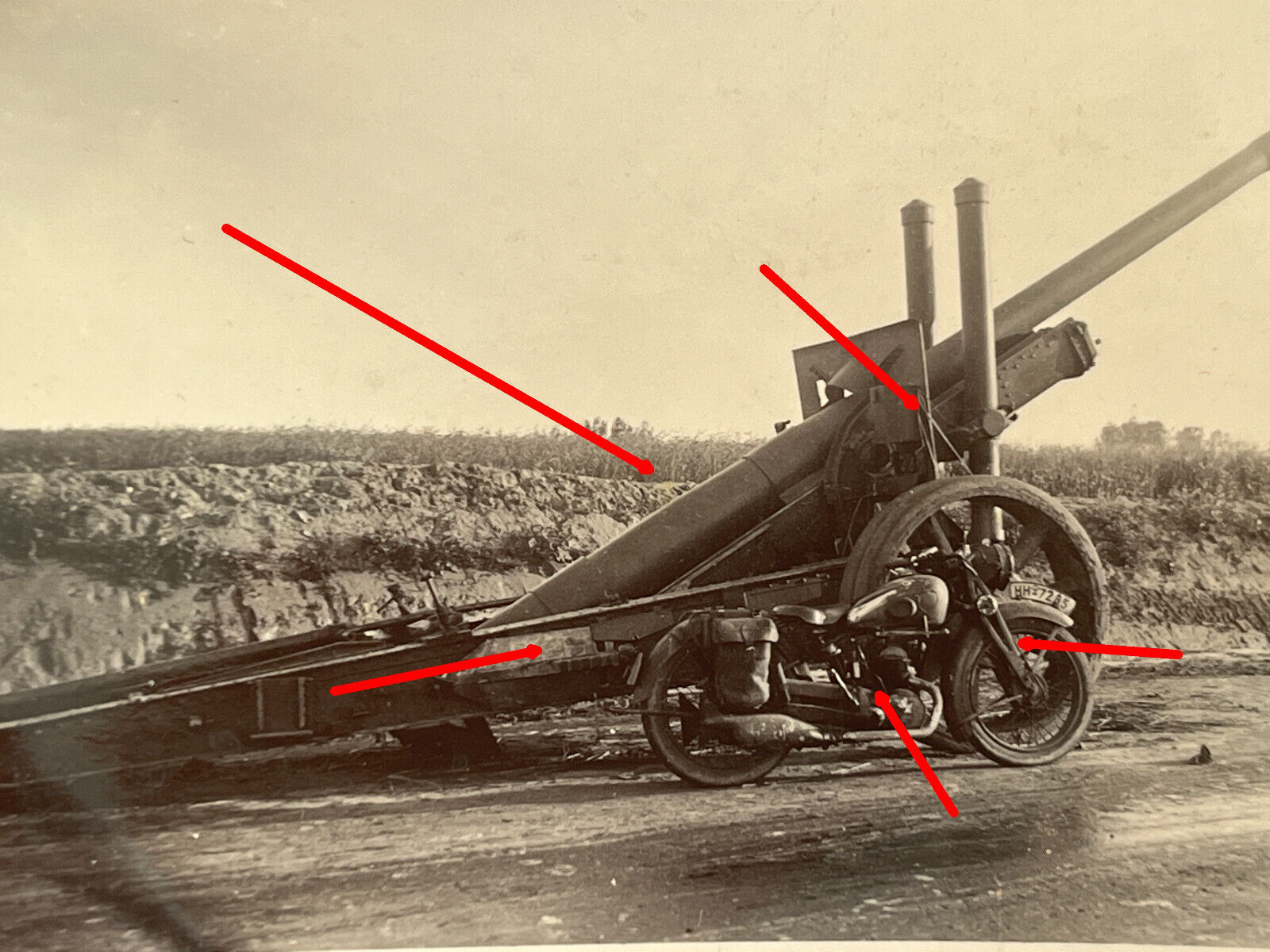 Foto, Schwere Art. Abt. 445, Krad vor Geschütz, Beutegeschütz, Motorrad, Ukraine