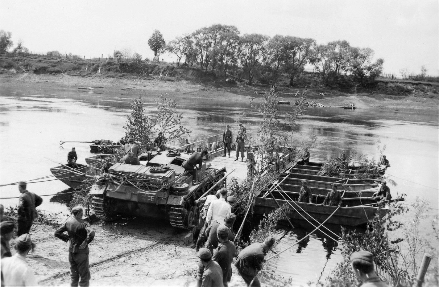 В качестве средства переправы используется перевозной паром Brueckengeraet B. За САУ, на заднем план