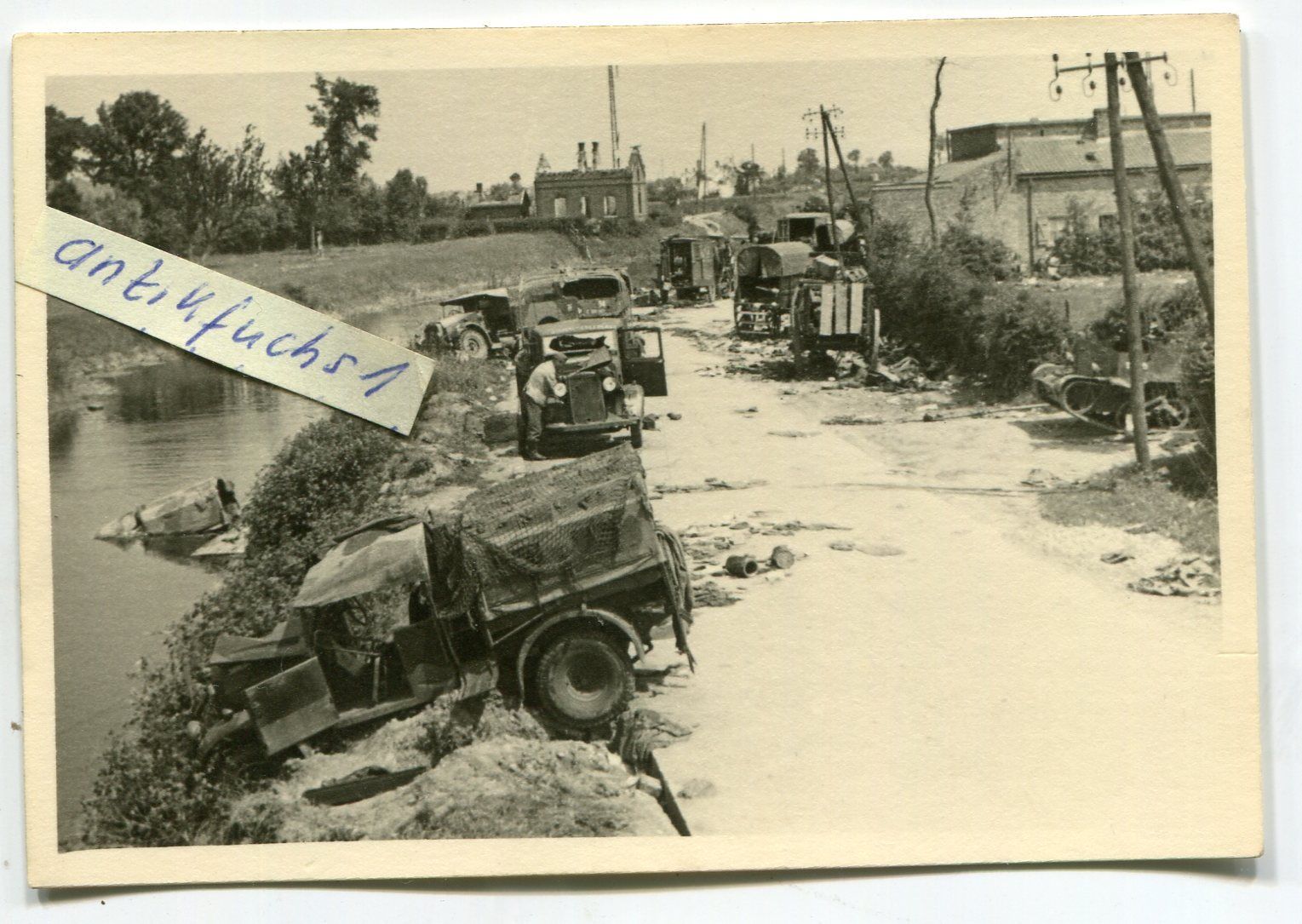 zerschossene Militär-Fahrzeuge aus England bei D