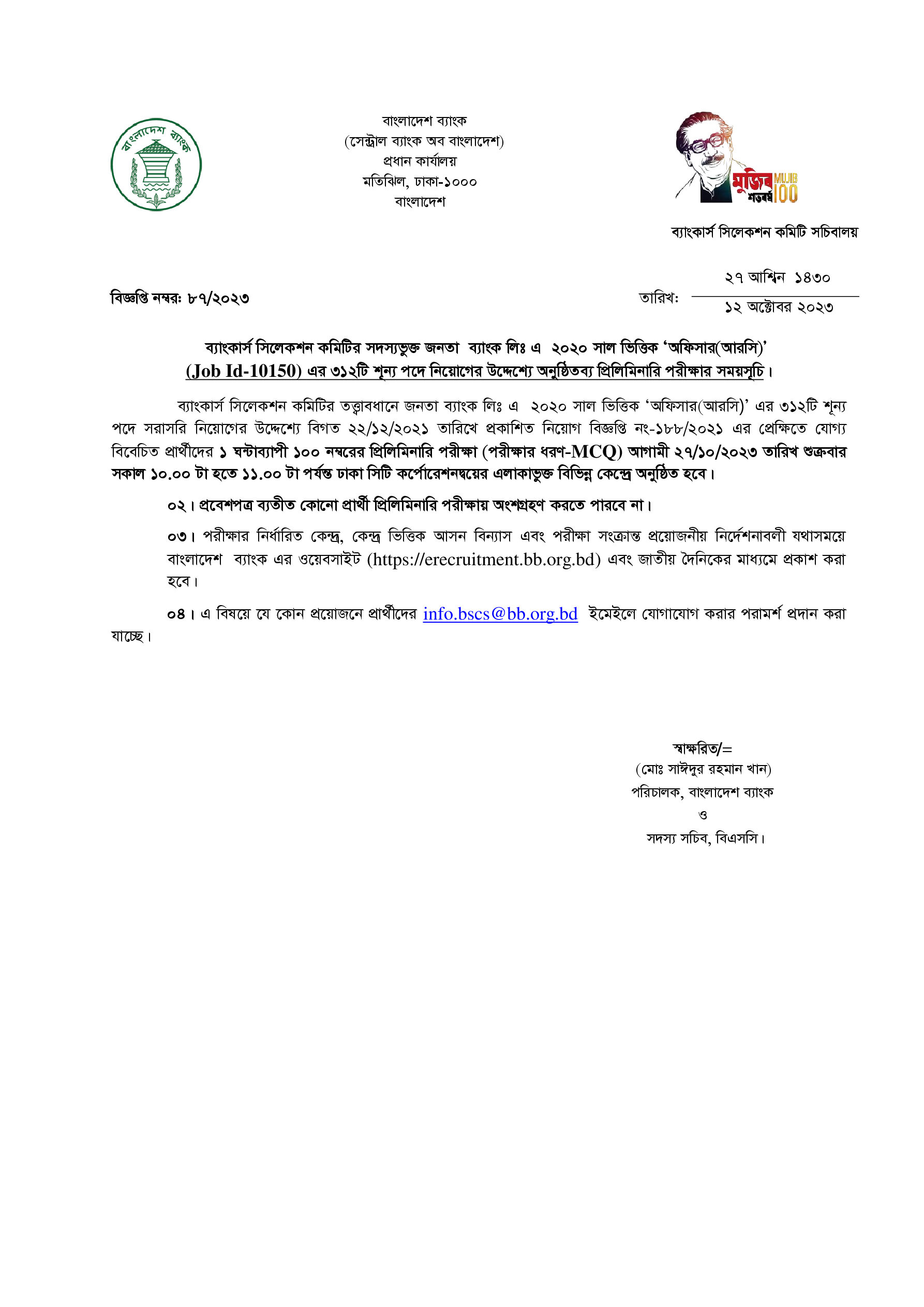 Janata Bank Officer (RC) MCQ Exam Date 2023 PDF