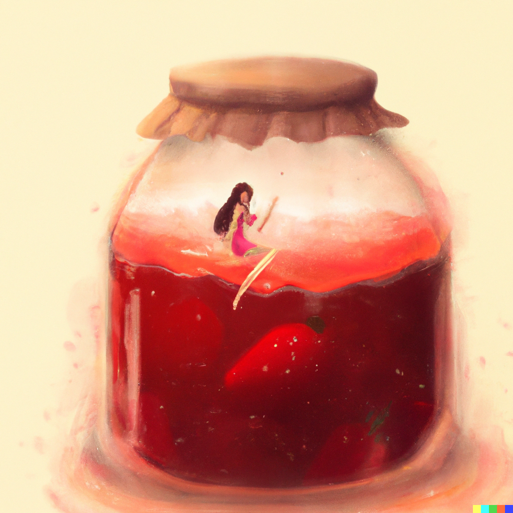 DALL·E 2022-09-07 17.33.18 - digital art of a tiny woman inside a giant jar of strawberry jam