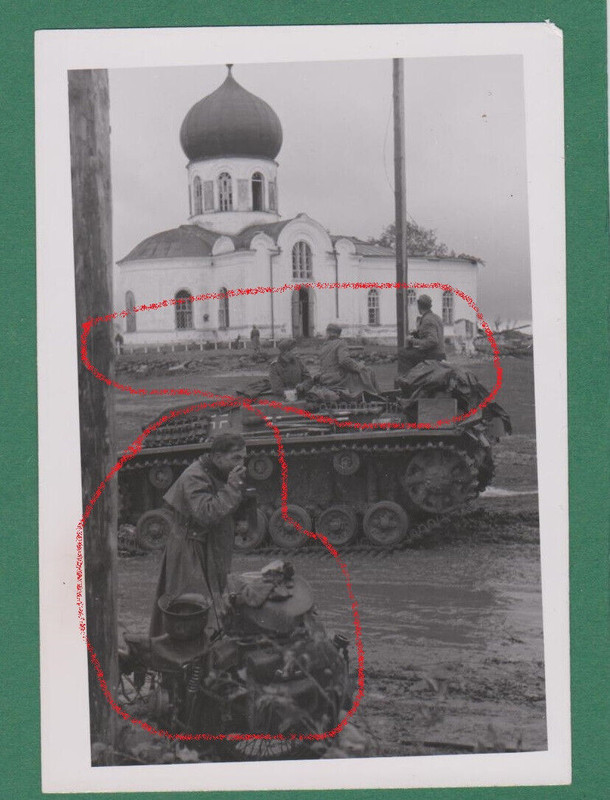 Foto WH Panzer Sturmgeschütz Panzermann Pz Kradmelder Kirche Ostfront WK2 Stug