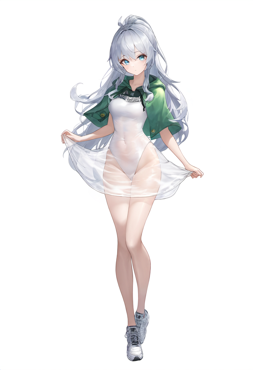 1girl, teenage, long hair, {{{see-through dress}}}, green capelet, white competi s-1985638873