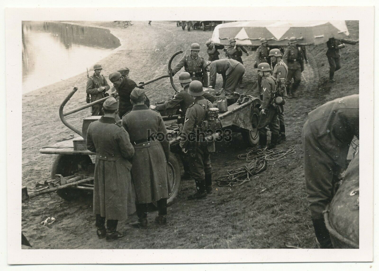! Foto Pioniere der Wehrmacht am Sonderanhänger für Sturmboote Sd. Anhänger
