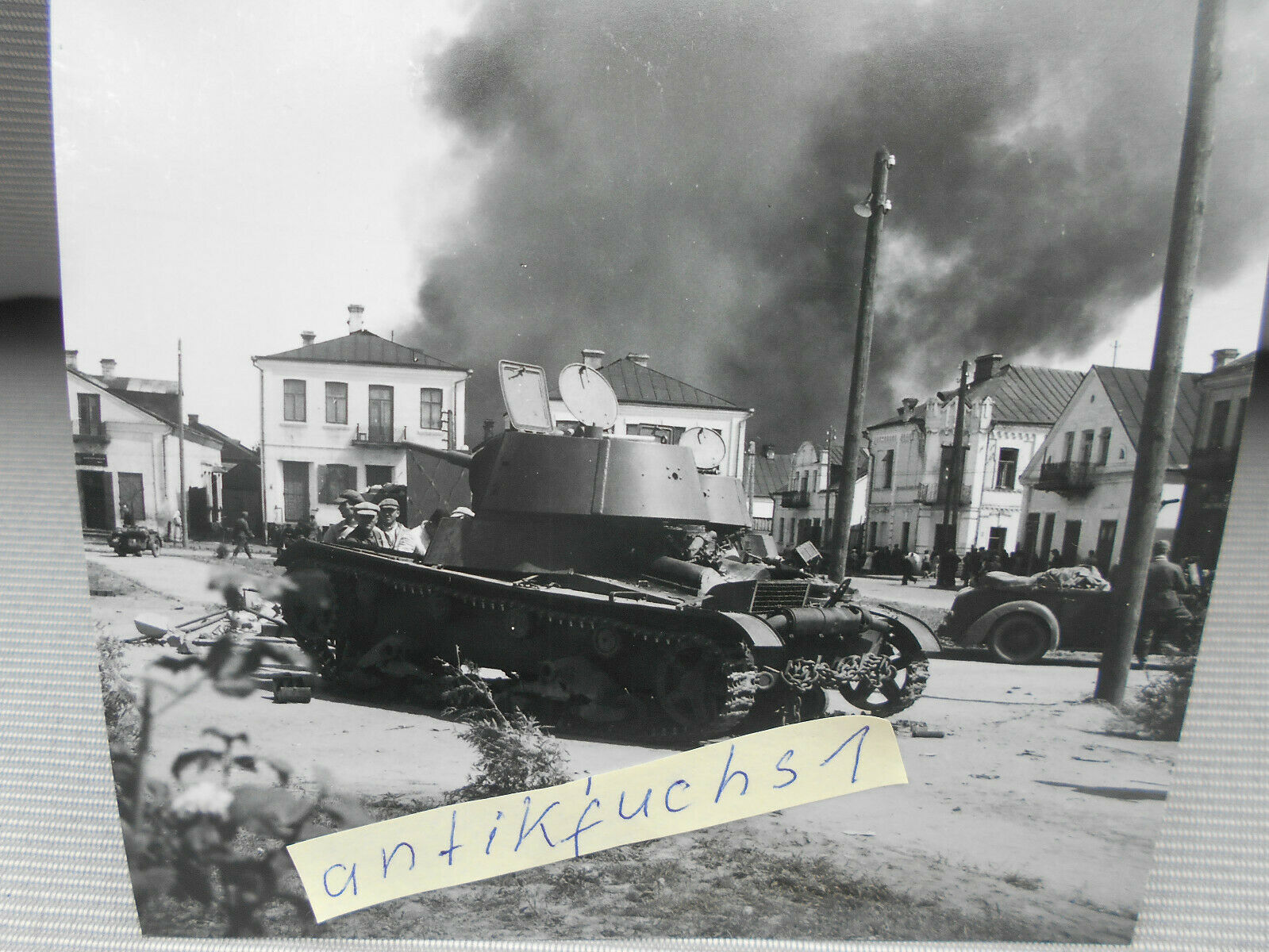 verlassener Russen-Panzer im brennenden Dorf in Rußland im 2.WK