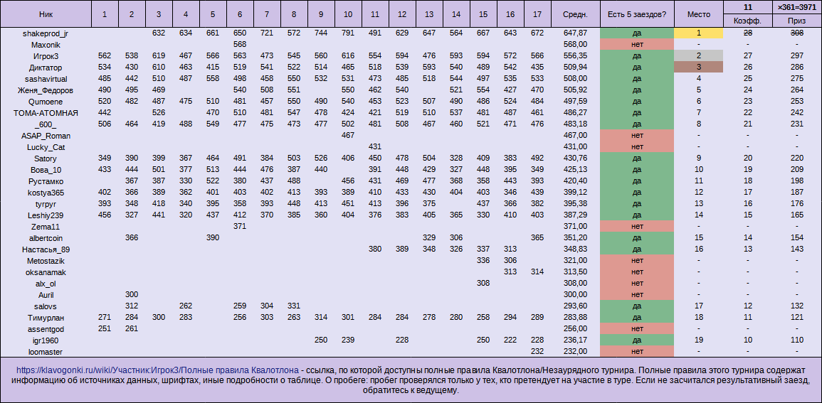 Незаурядный турнир №2, общий зачёт