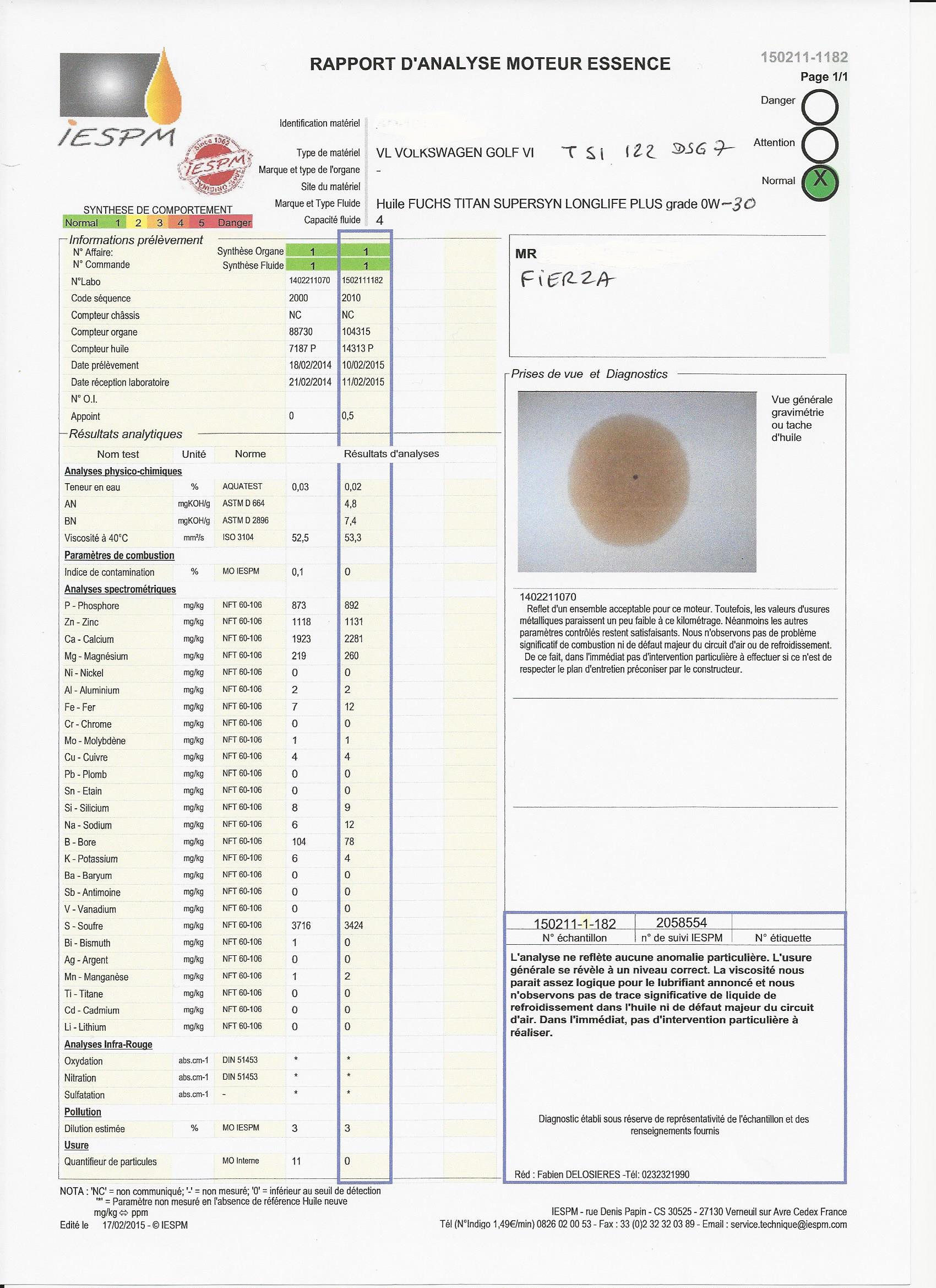 Analyse Huile Moteur G 6 FIERZA_VW 503 - 2014-2015- Rapport déta
