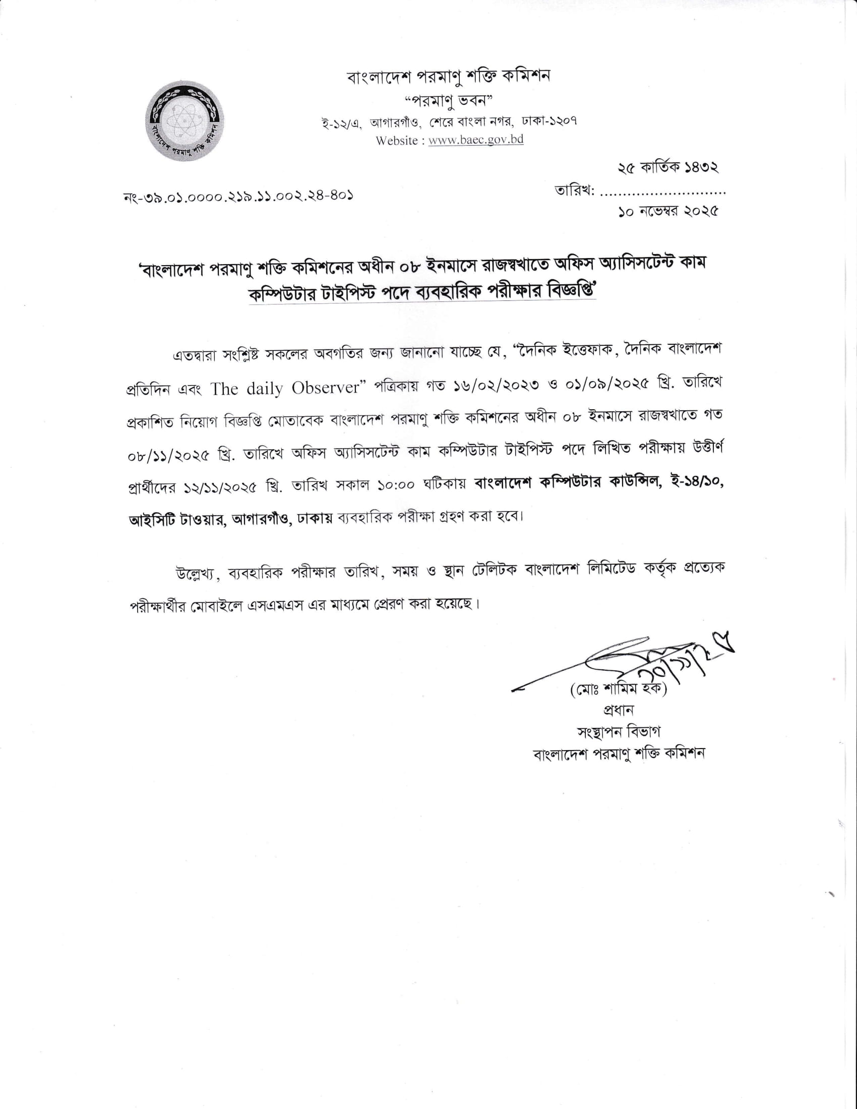 BAEC Office Assistant Cum Computer Typist Practical Test Date 2025 PDF 1