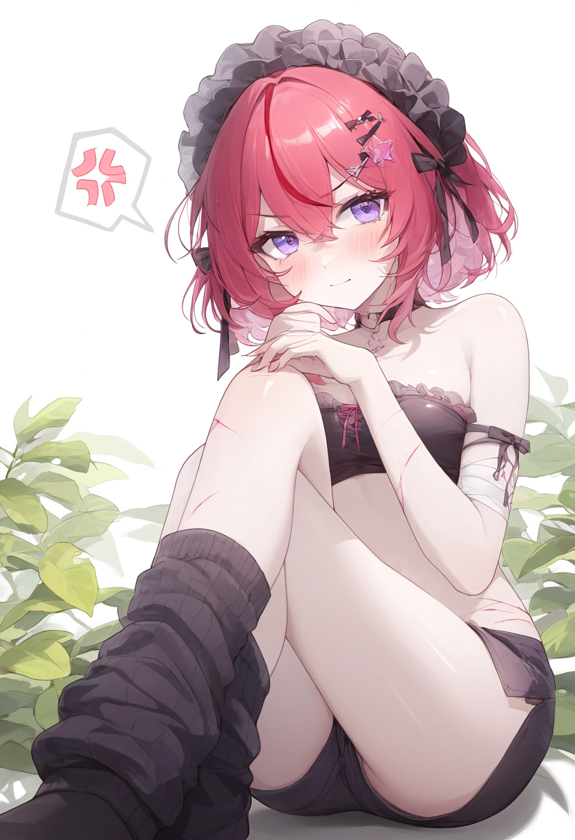 1girl, leaf background, pale skin, very short hair, red hair, streaked hair, pin s-2332639189