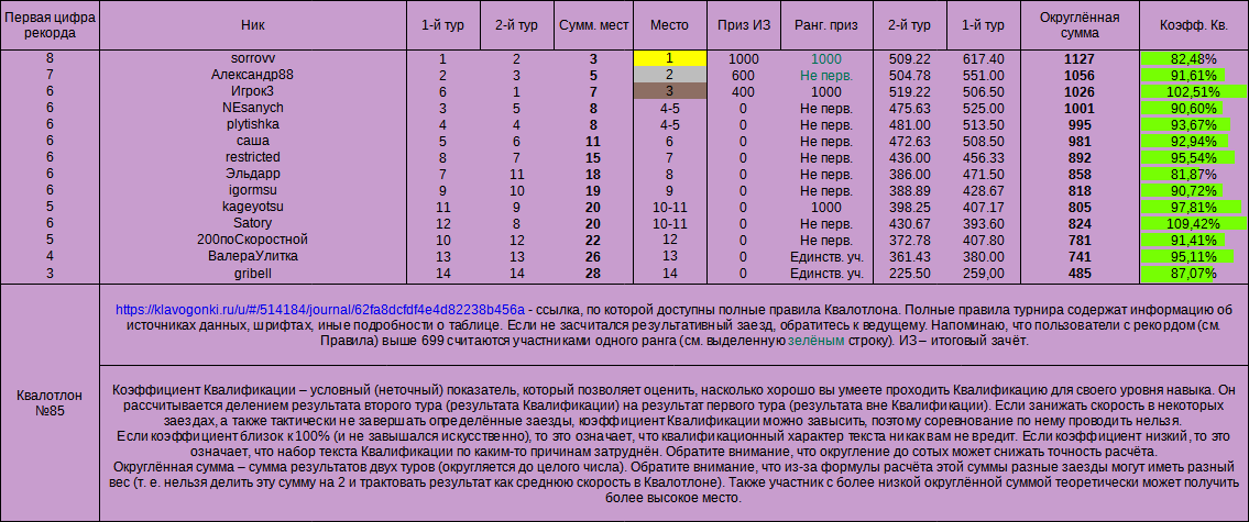 Квалотлон 85, итоги