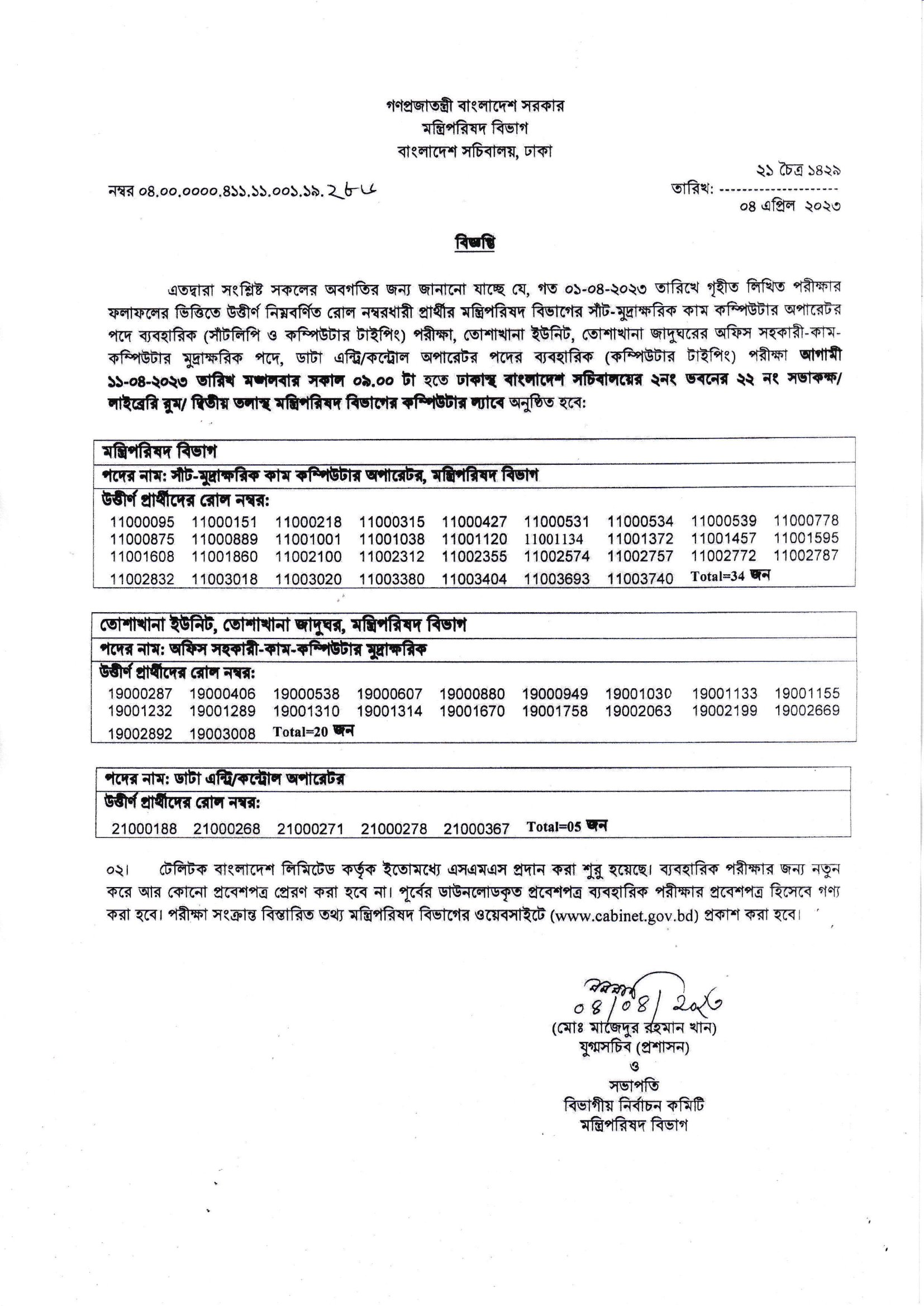 Cabinet Division Practical Test Date 2023 PDF