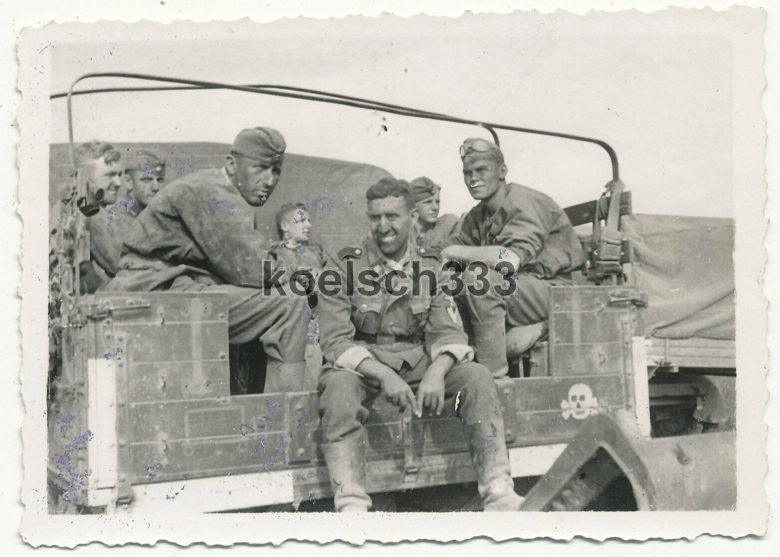 Foto Frontkämpfer mit staubigen Gesichtern auf LKW mit Totenkopf Kennung ... !