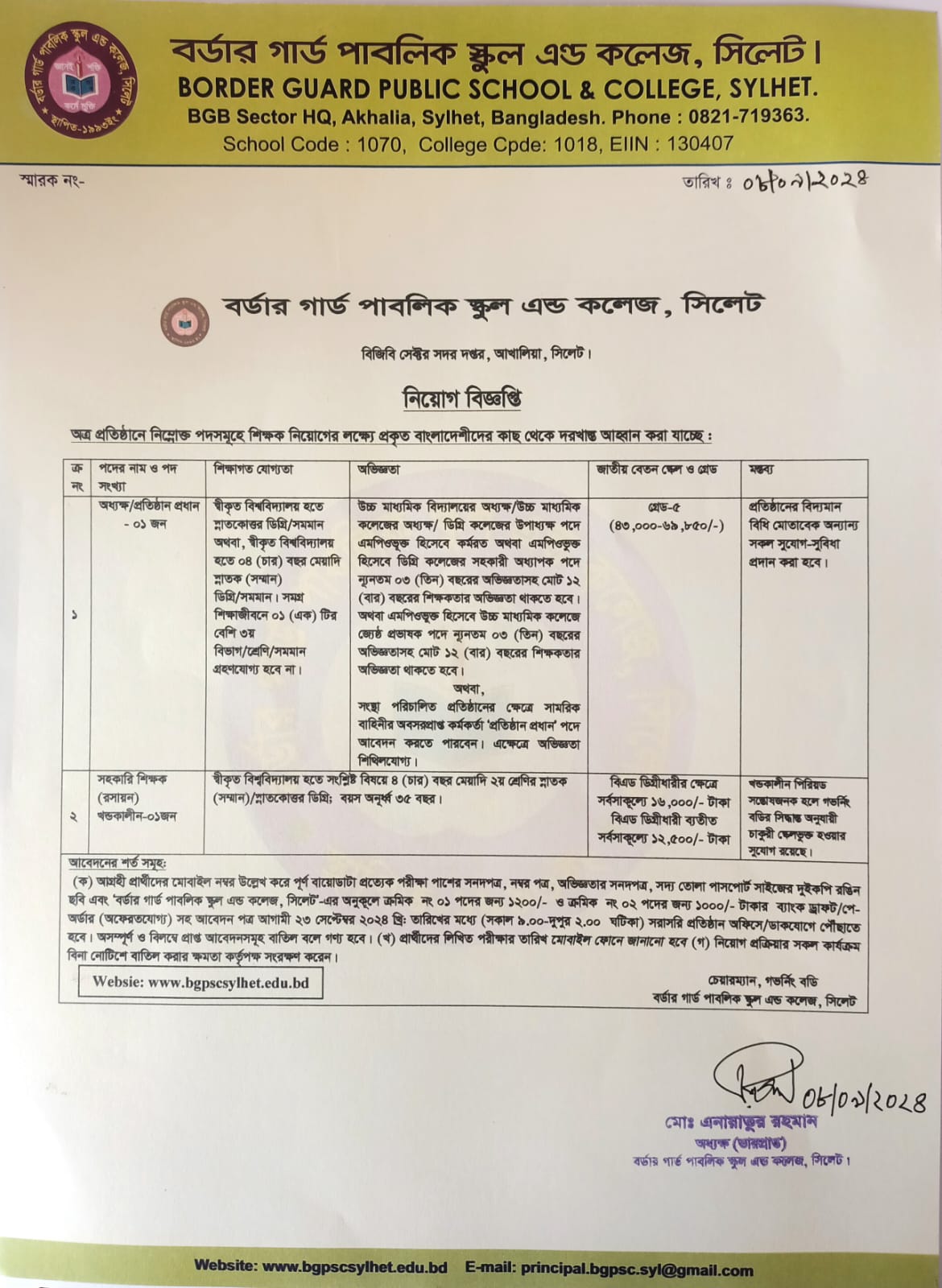 Border Guard Public School and College Sylhet (BGPSC) Job Circular 2024
