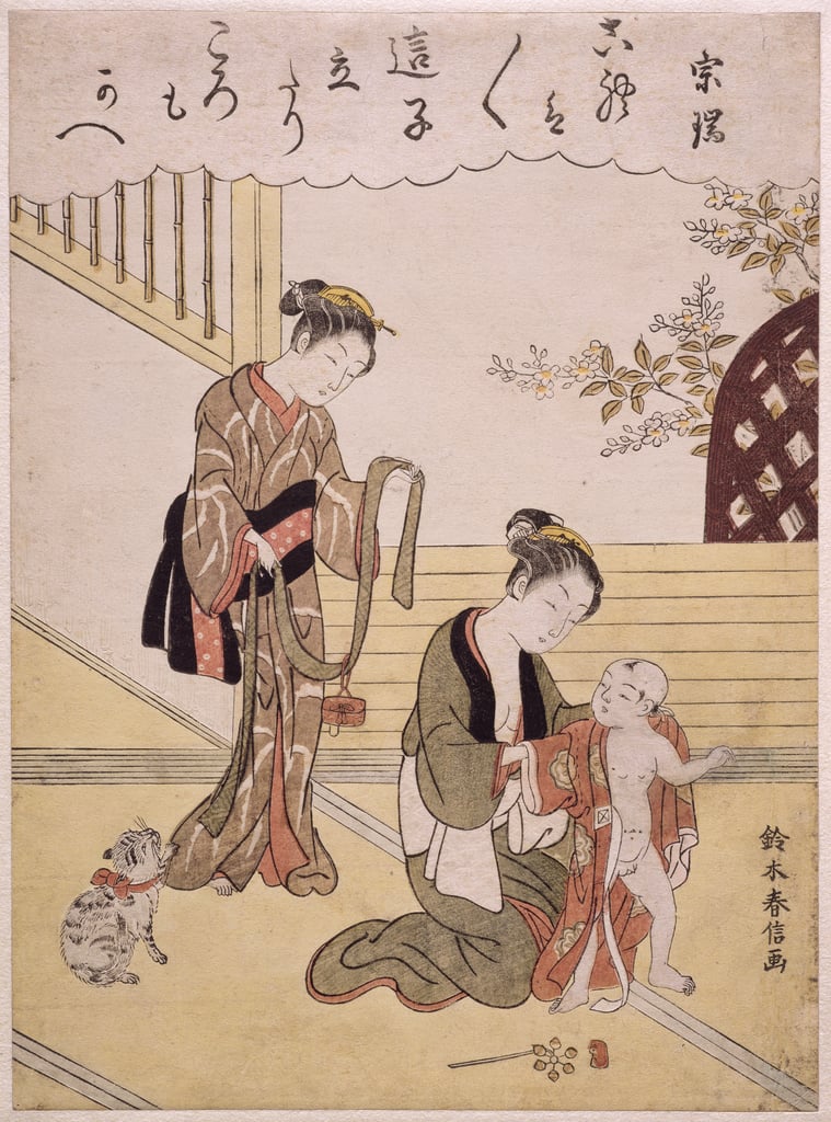 2-Suzuki_Harunobu_-_P312-1941_A_mother_dressing_her_young_son_in_a_kimono_(colour_woodblock_print)_-