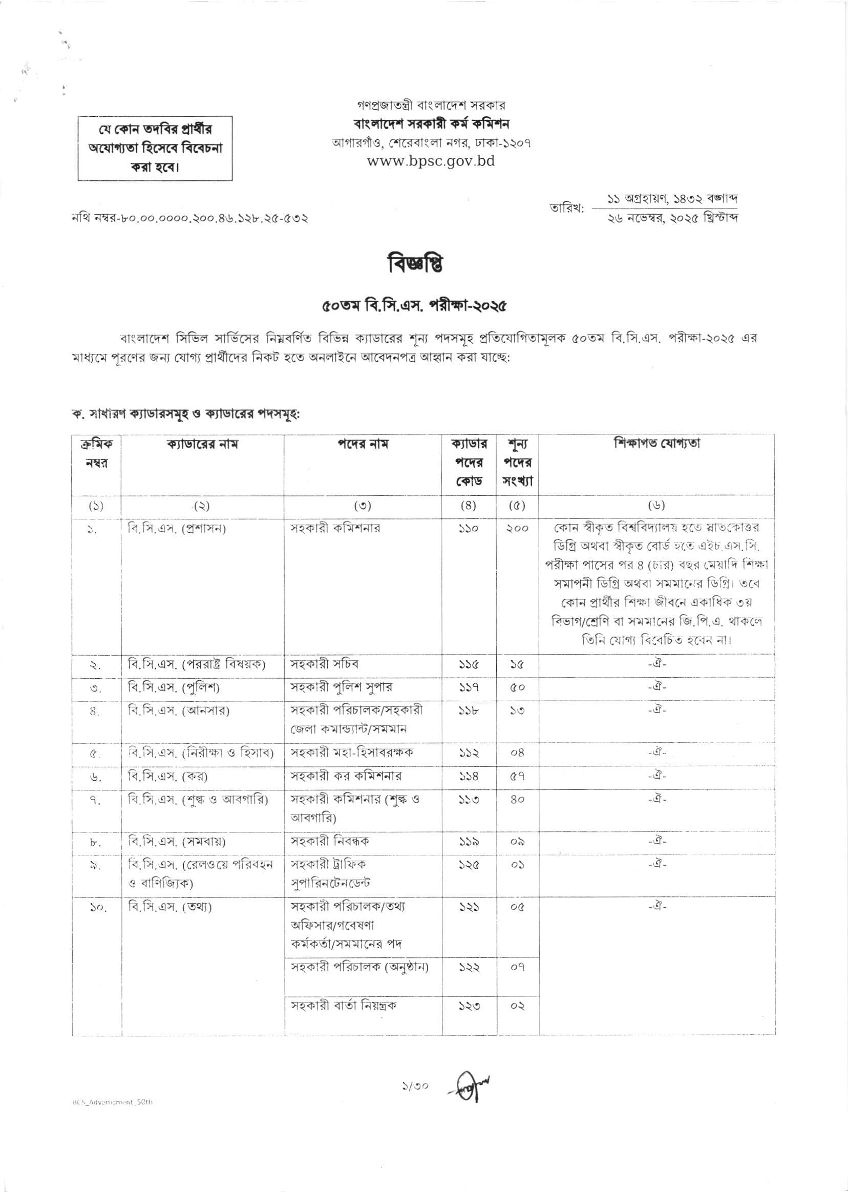 50th BCS Job Circular 2025 PDF 01