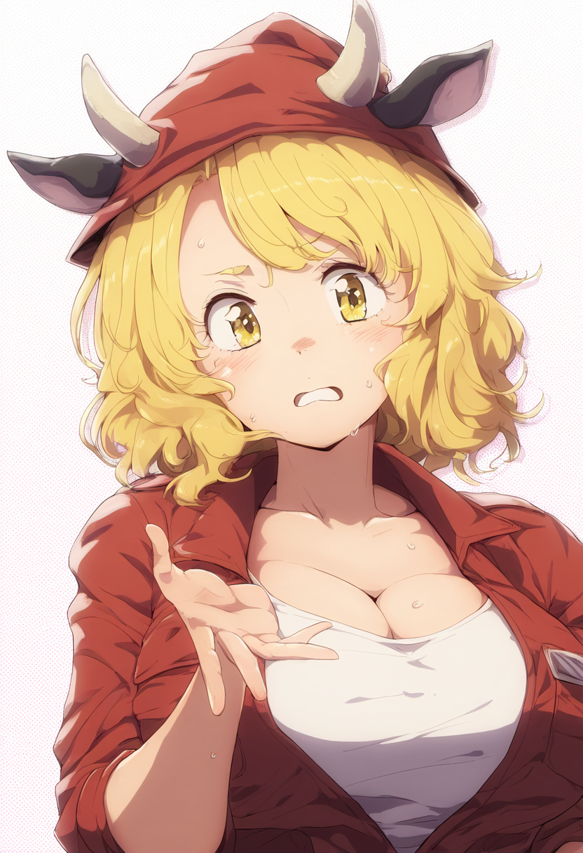 1girl, 1970s (style), polka dot background, portrait, cow ears, cow horns, yello s-2045823690
