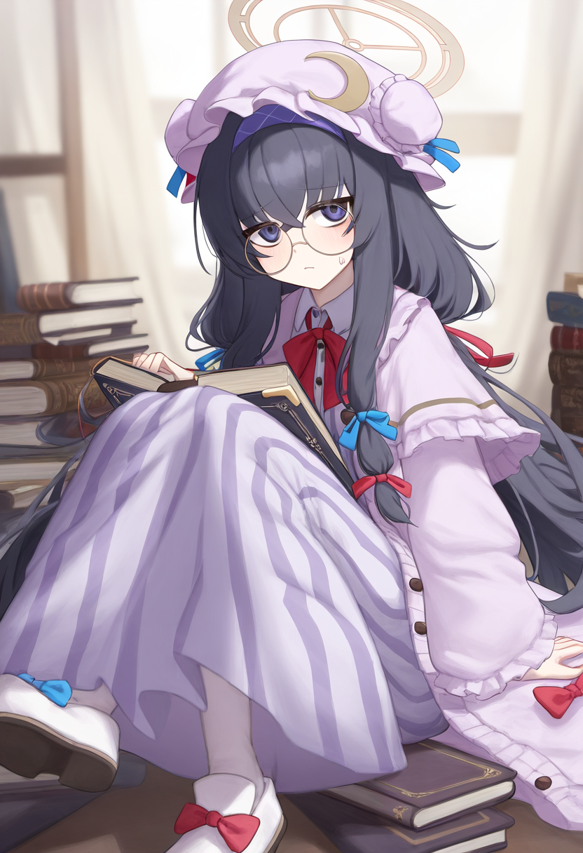 depth of field, 1girl, {ui(blue archive)}, patchouli knowledge (cosplay), {borro s-1288577957