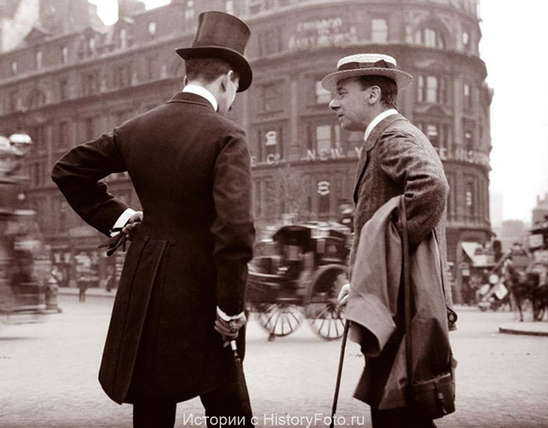 Два-элегантно-одетых-джентльмена-болтают-на-улице-в-Лондоне-пока-проезжают-повозки-и-лошади.-1904