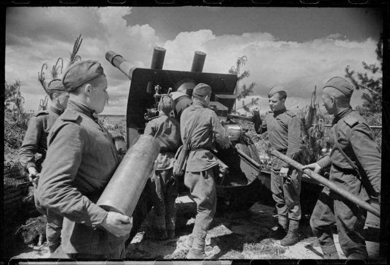 2-й Прибалтийский фронт. Орудийный расчет сержанта Ярошевского на огневой позиции. Заряжают 152-мм п