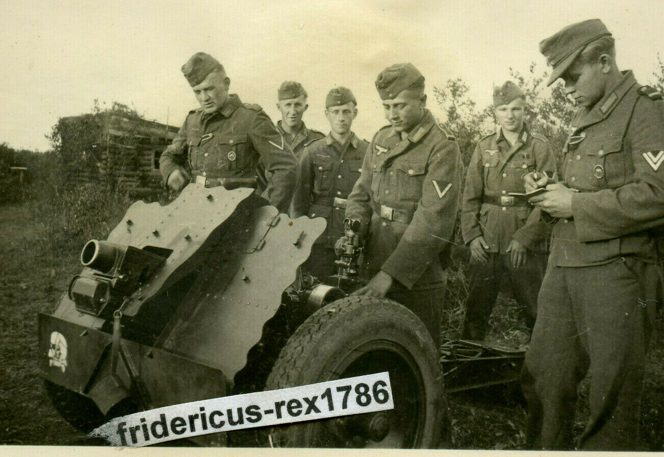 Foto Ostfront T.-Div Raum Demjansk HKL Infanterie Geschütz 18 mit Wappen Kennung