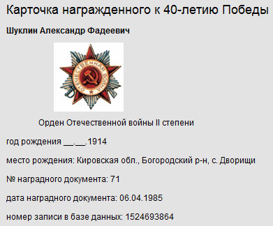 Карточка награжденного 85 г