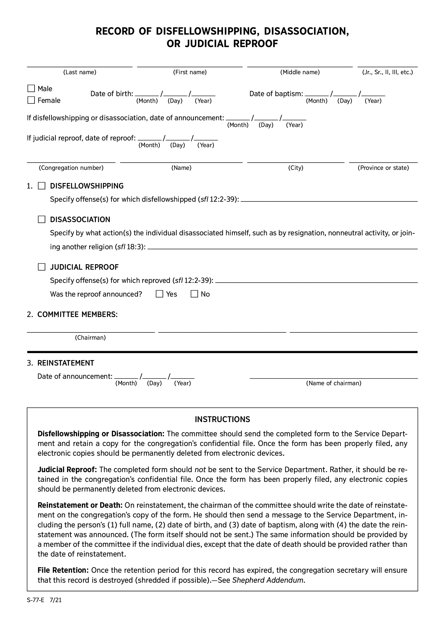 S-77-E (Notification of Disfellowshipping or Disassociation or reproof 2021-07)