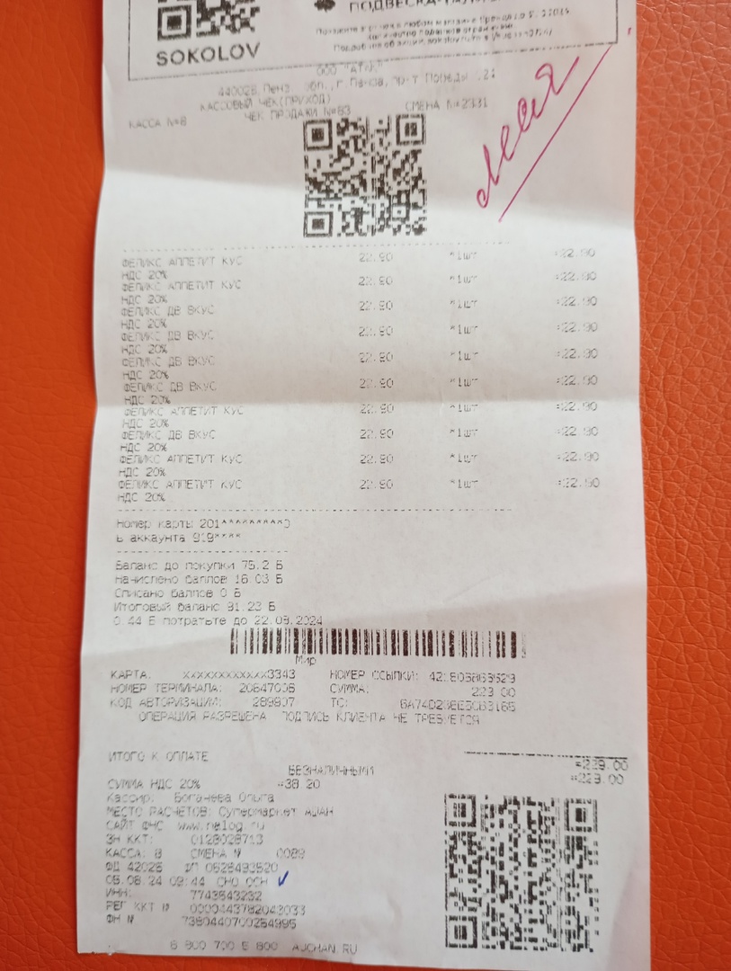 леся чек 05.08.2024 феликс 229,00