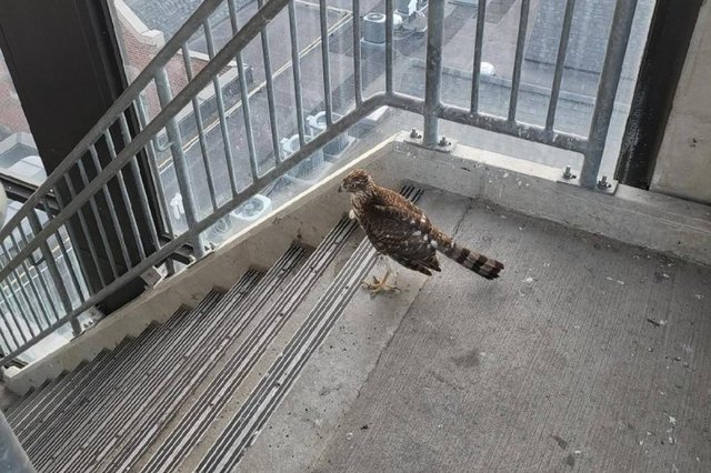 Stranded-hawk-rescued-from-parking-garage-stairwell