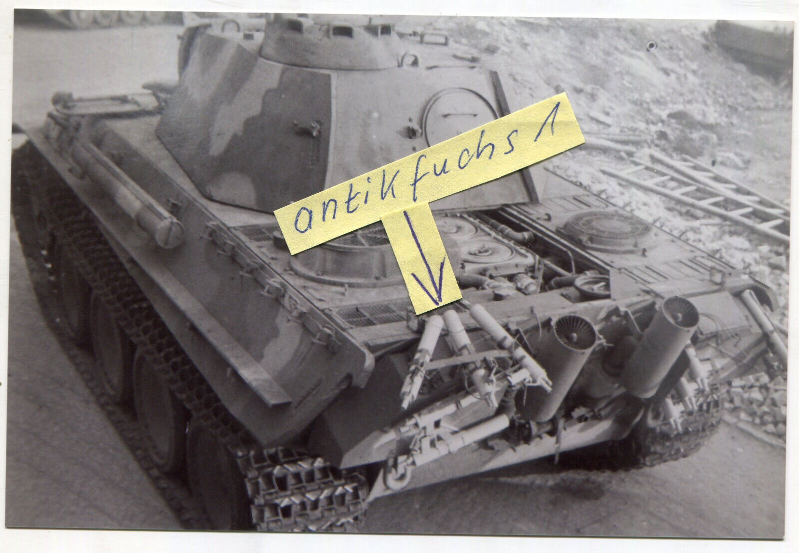 Foto-Abzug nach 1945 (1) Panzer Panther mit Flammenwerfer-Abwehr in Wildau 1943