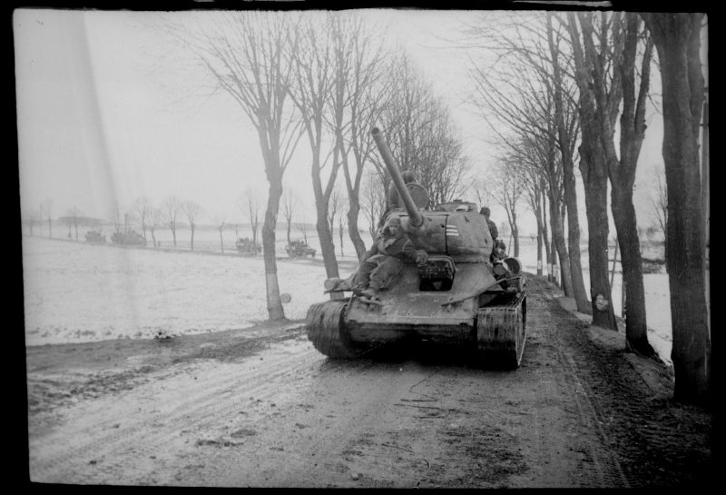 1-й Белорусский фронт. Берлинское направление. Танк Т-34-85 с десантом на броне.2